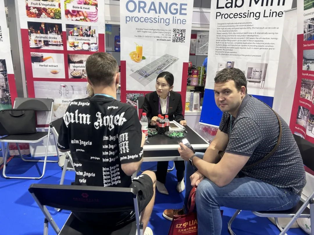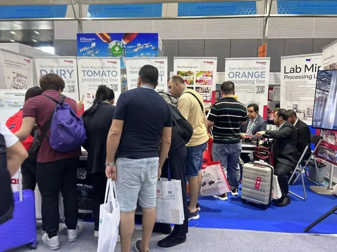 展会现场,沃迪智能的展台前人头攒动,不断有来自全球各地的观众驻足围观番茄、菠萝、芒果、椰子、柑橘等果蔬以及乳品智能产线的精彩案例展示,同时还有众多客户前来展位探讨和咨询果蔬深加工相关的技术难题。沃迪智能的专业服务、创新解决方案及丰富的案例经验,受到了广大客户的高度认可和赞誉。