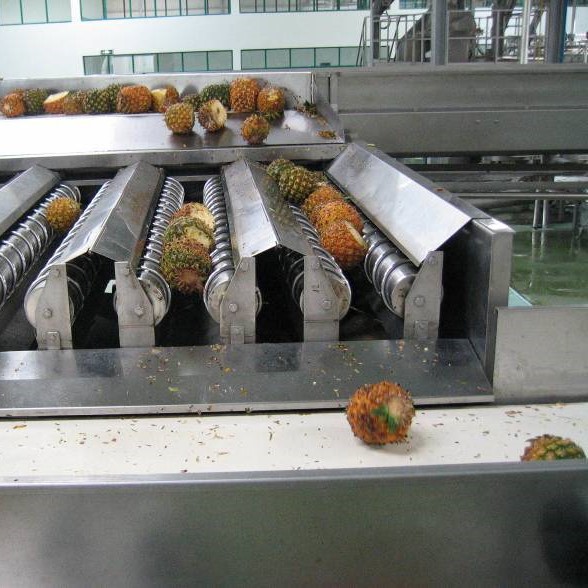 适用于芒果、菠萝等热带水果的加工,可生产清汁、浊汁、浓缩果汁、芒果/菠萝罐头及果酱等产品。该生产线主要由鼓泡清洗机、提升机、检果机、毛刷洗果、切块机、预煮机、去皮去核打浆机、破碎机、带式榨汁、分离机、浓缩设备、杀菌机及灌装机等设备组成。本生产线设计理念先进、自动化程度高;主体设备全部采用优质不锈钢材质制造,完全符合食品加工的卫生要求。