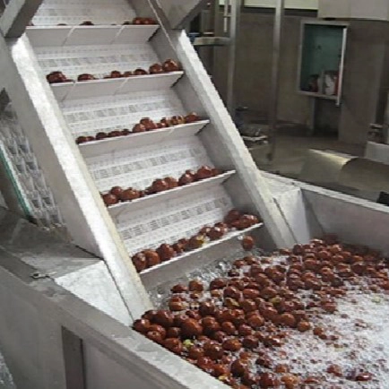 适用于枣(椰枣、红枣)、山楂类水果的加工,可生产干果、干鲜果、果粉、果汁及浓缩果汁等产品。该生产线主要由鼓泡清洗机、提升机、检果机、分级机、沥水风干机、烘干机、去核机、破碎机、萃取罐、分离机、杀菌机及灌装机等设备组成。本生产线设计理念先进、自动化程度高;主体设备全部采用优质不锈钢材质制造,完全符合食品加工的卫生要求。