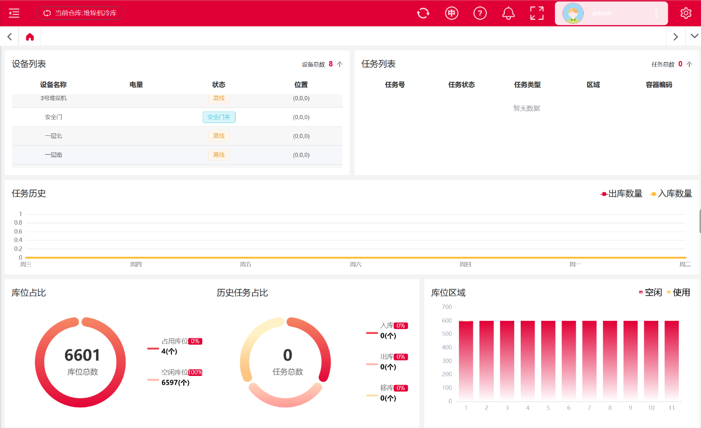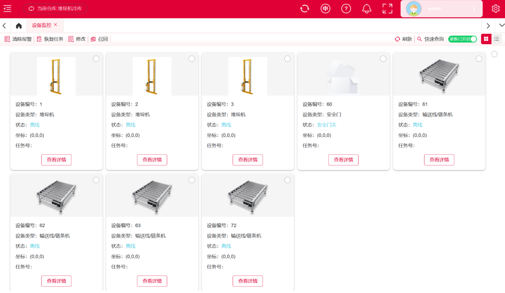 可以实时监控设备状态,随时清除故障,或者恢复任务等操作支持设备运行状态及位置的二维监控,每台设备都配置坐标、任务号等,更直观的看到设备的详情。