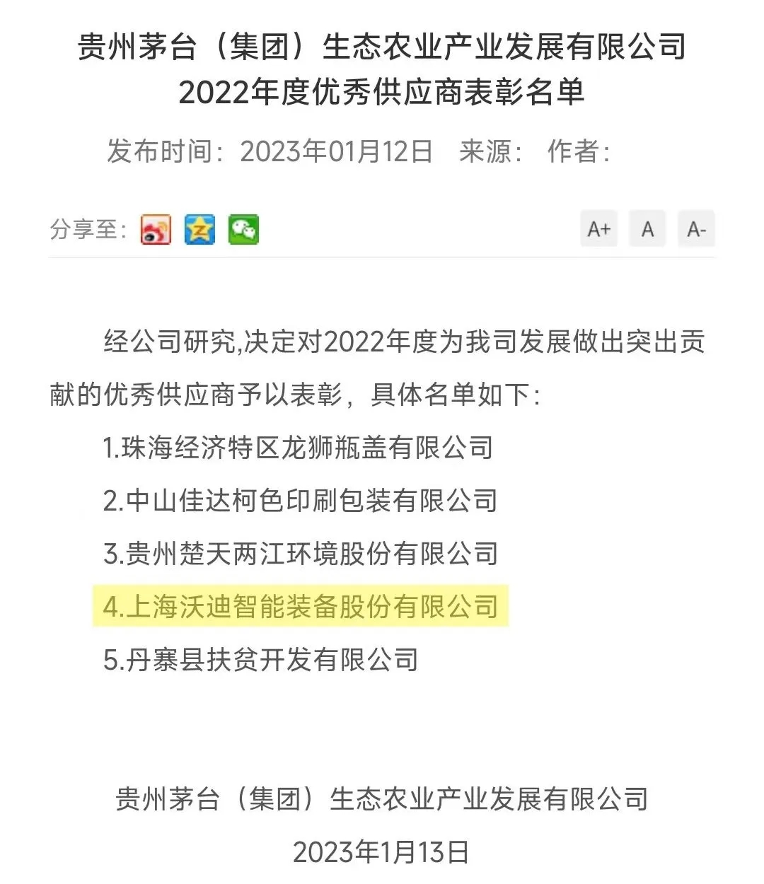 上海沃迪智能装备股份有限公司有幸获此殊荣,荣获“2022年度优秀供应商”称号,这是对沃迪的高度肯定,我们也将为持续提升茅台产业链韧性与生产水平贡献力量。
